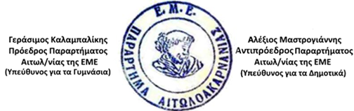 Η Διοικούσα Επιτροπή του Παραρτήματος Αιτωλοακαρνανίας της ΕΜΕ στηρίζει τον διαγωνισμό «ΠΥΘΑΓΟΡΑΣ» και έχει αναλάβει την ευθύνη για τη διεξαγωγή του στην περιοχή μας, δημιουργώντας εξεταστικό κέντρο. Για τη διαδικασία εγγραφής στο εξεταστικό κέντρο της Αιτωλοακαρνανίας, οι μαθητές μπορούν να απευθύνονται στο σχολείο τους ή στο email του Παραρτήματος Αιτωλοακαρνανίας της ΕΜΕ (emeaitol@gmail.com) ή στους υπεύθυνους του διαγωνισμού:
