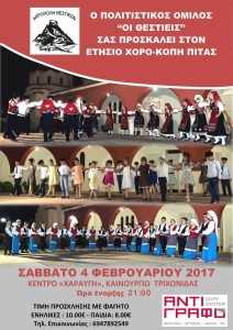 O πολιτιστικός όμιλος “Οι Θεστιείς” σας προσκαλεί στον ετήσιο χορό-κοπή πίτας, το Σάββατο 4 Φεβρουαρίου.