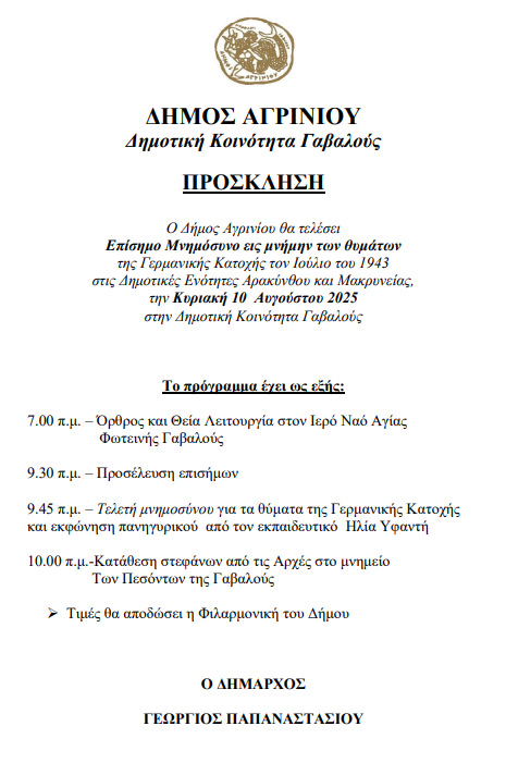 Ετήσιο επίσημο μνημόσυνο Δ. Αγρινίου στην Δ.Ε. Γαβαλούς-Το πρόγραμμα