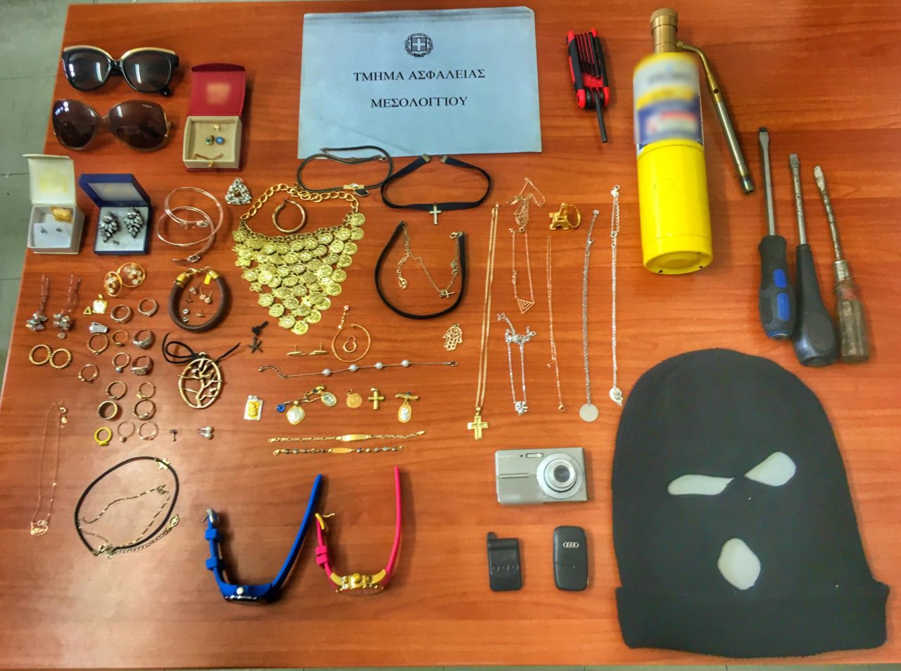 Σε σωματική έρευνα που ενήργησαν οι αστυνομικοί στον δράστη κατά τη σύλληψή του βρήκαν και κατέσχεσαν μια μάλλινη κουκούλα τύπου full face, ένα μεταλλικό φλόγιστρο, τρία κατσαβίδια, ένα σετ πολυγωνικών κλειδιών, καθώς και τα κλεμμένα κοσμήματα, τα οποία αποδόθηκαν στην παθούσα.Οι έρευνες των αστυνομικών συνεχίζονται προκειμένου να εξακριβωθεί αν ο δράστης συμμετείχε και σε άλλες περιπτώσεις κλοπής.