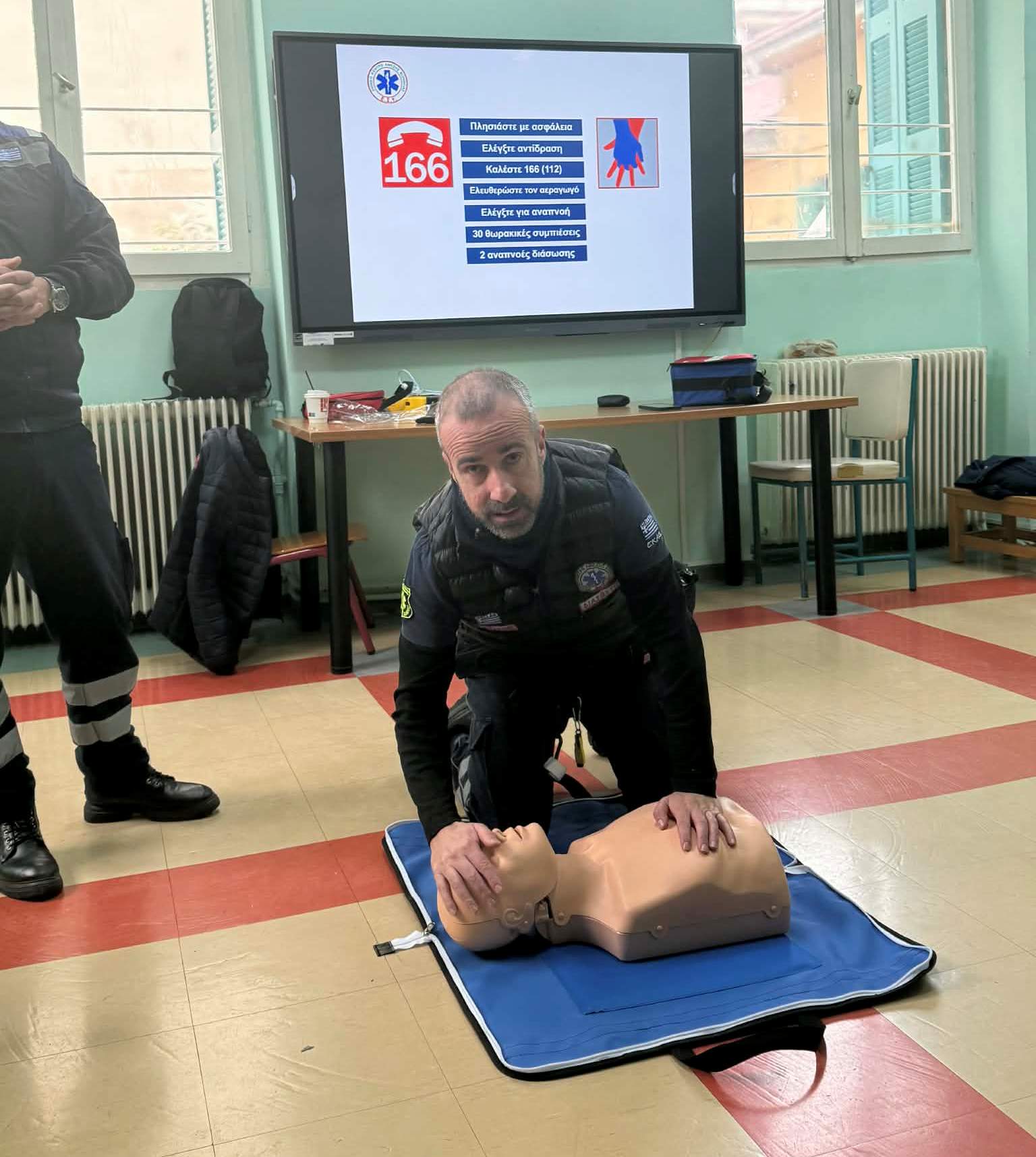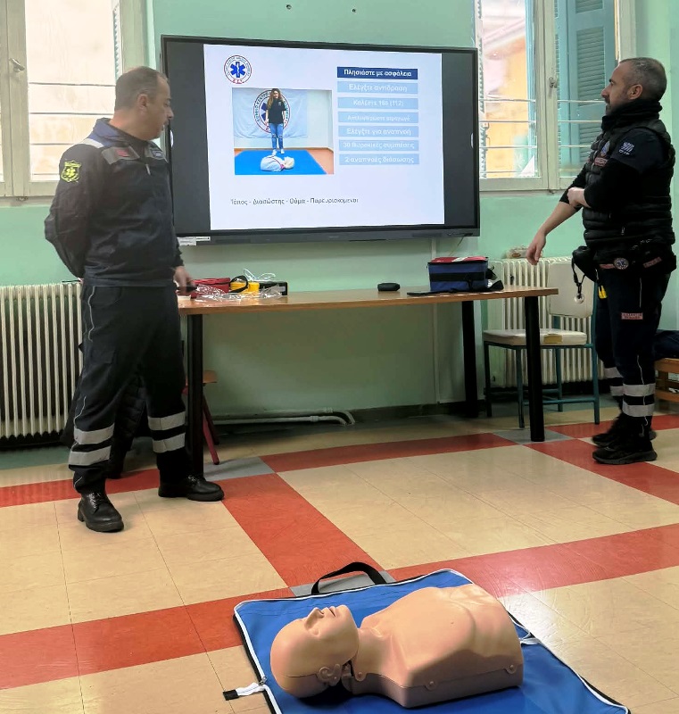 Ευχαριστούμε ιδιαιτέρως τα στελέχη  του ΕΚΑΒ, τον διασώστη – εκπαιδευτή  κ. Καραμάνη Βασίλειο και τον κ. Γκούβελο Βασίλειο διασώστη, οι οποίοι παρουσίασαν το θέμα με απόλυτα κατανοητό τρόπο, αποδεικνύοντας την υψηλή τους κατάρτιση και τον άψογο επαγγελματισμό τους και κατάφεραν να μας μεταφέρουν χρήσιμες πληροφορίες και  γνώσεις σε θέματα πρώτων βοηθειών, όπως η καρδιοπνευμονική αναζωογόνηση (ΚΑΡΠΑ), χρήση αυτόματου εξωτερικού απινιδωτή και αντιμετώπιση πνιγμονών,  πραγματοποιώντας ένα 4ωρο χρήσιμο επιμορφωτικό σεμινάριο.