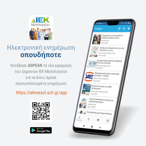 Δημοσιεύθηκε στο Google play η επίσημη εφαρμογή του Δημόσιου ΙΕΚ Μεσολογγίου για Android έξυπνες κινητές συσκευές.