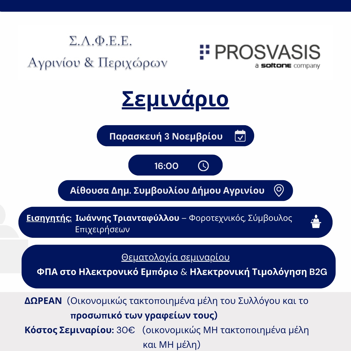 Η Ένωση Λογιστών Φοροτεχνικών Αιτωλ/νιας διοργανώνει, με την υποστήριξη της Prosvasis, ενημερωτικό σεμινάριο με θέμα: “ΦΠΑ στο ηλεκτρονικό εμπόριο & Ηλεκτρονική Τιμολόγηση B2G”.