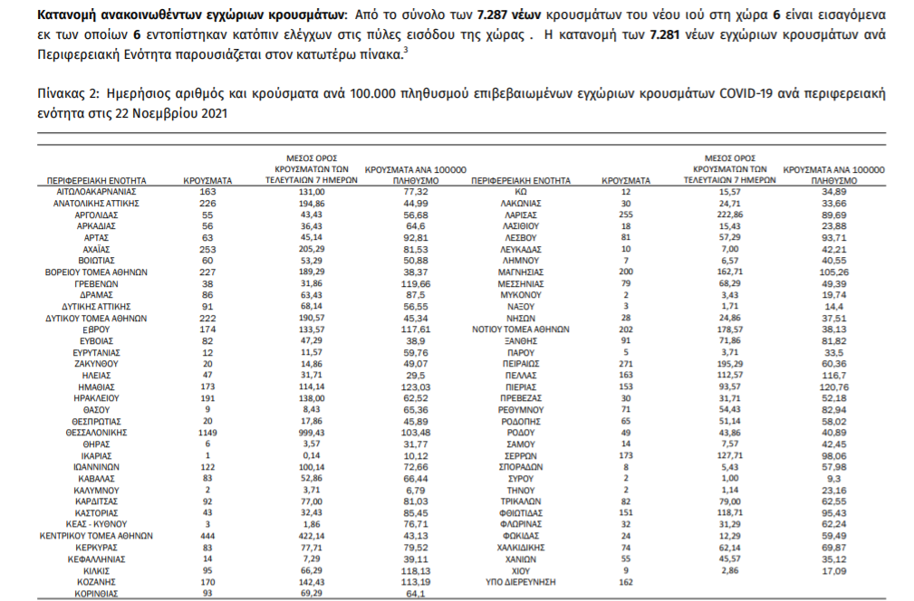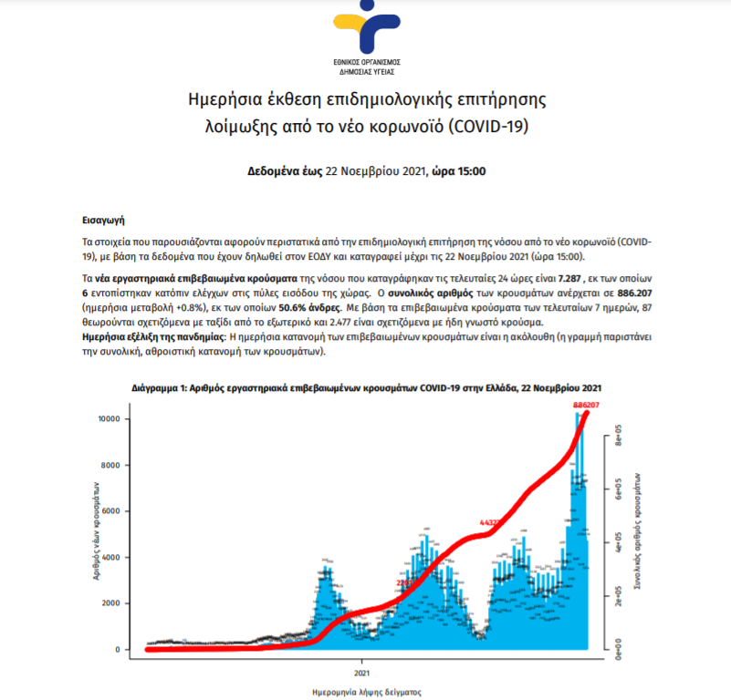Ημερήσια έκθεση επιδημιολογικής επιτήρησης λοίμωξης από το νέο κορωνοϊό (COVID-19) Δεδομένα έως 22 Νοεμβρίου 2021, ώρα 15:00.