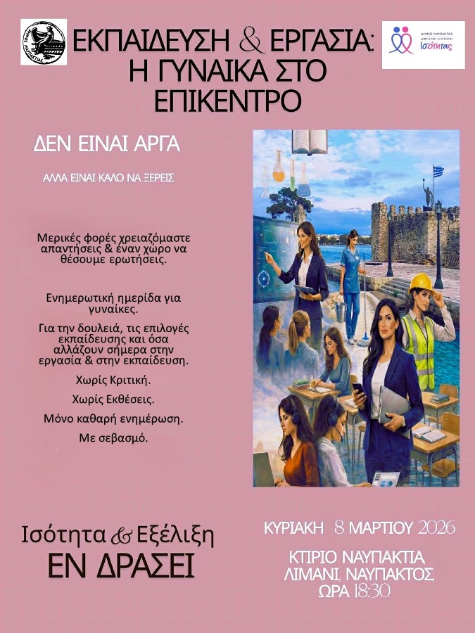 Ο Δήμος Ναυπακτίας και η Επιτροπή Ισότητας Δήμου Ναυπακτίας, τιμώντας την Ημέρα της Γυναίκας, διοργανώνουν ημερίδα με τίτλο «Εκπαίδευση και Εργασία: Η γυναίκα στο Επίκεντρο», με στόχο την ενημέρωση γύρω από τις σύγχρονες απαιτήσεις της αγοράς εργασίας, τις διαθέσιμες δυνατότητες εκπαίδευσης και κατάρτισης, καθώς και τις προοπτικές επαγγελματικής εξέλιξης των γυναικών. Η εκδήλωση θα πραγματοποιηθεί την Κυριακή, 8 Μαρτίου, στο κτήριο «Ναυπακτία» (Λιμάνι Ναυπάκτου), στις 18:30’.