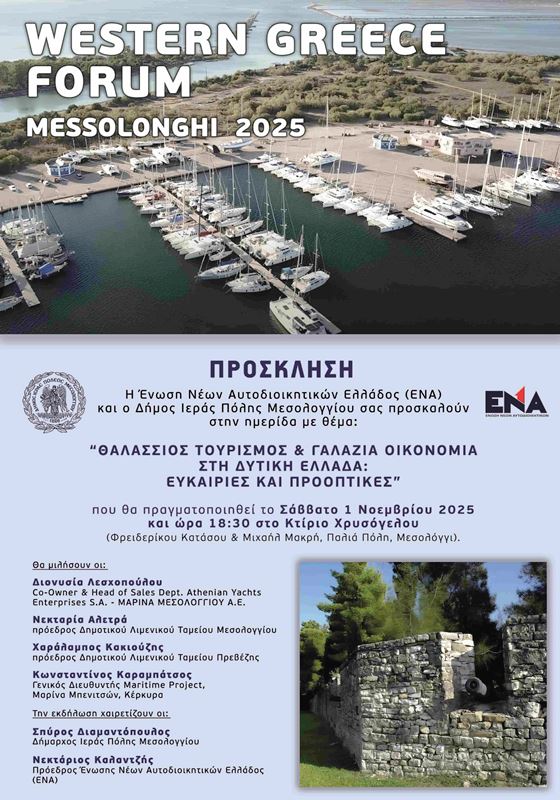 Ο Δήμος Ιερής Πόλης Μεσολογγίου, σε συνεργασία με την Ένωση Νέων Αυτοδιοικητικών Ελλάδος (ΕΝΑ), διοργανώνει το Western Greece Forum Messolonghi 2025, με θέμα: