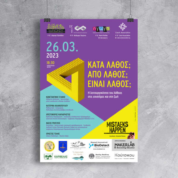 Η Czech Association σε συνεργασία με τα φροντιστήρια «Αγωγή», «bioΝΟΗΣΗ» και «εις τη ν», σας προσκαλούν στην ημερίδα «Κατά λάθος; Από λάθος; Είναι λάθος; Η λειτουργικότητα του λάθους στις επιστήμες, στην τέχνη και τη ζωή», που θα διεξαχθεί την Κυριακή 26.03.2023, στις 18.30, στο Παπαστράτειο Μέγαρο Αγρινίου. Είσοδος ελεύθερη.