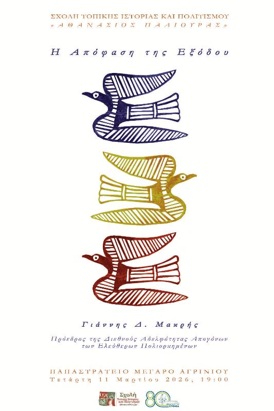 Η Σχολή Τοπικής Ιστορίας και Πολιτισμού “Αθανάσιος Παλιούρας”, της Γυμναστικής Εταιρείας Αγρινίου, παρουσιάζει την Τετάρτη 11 Μαρτίου 2026 και ώρα 19:00 στο Παπαστράτειο Μέγαρο Αγρινίου τον πρόεδρο της Διεθνούς Αδελφότητας Απογόνων των Ελεύθερων Πολιορκημένων Γιάννη Δ. Μακρή. Θέμα της ομιλίας του: “Η Απόφαση της Εξόδου”.