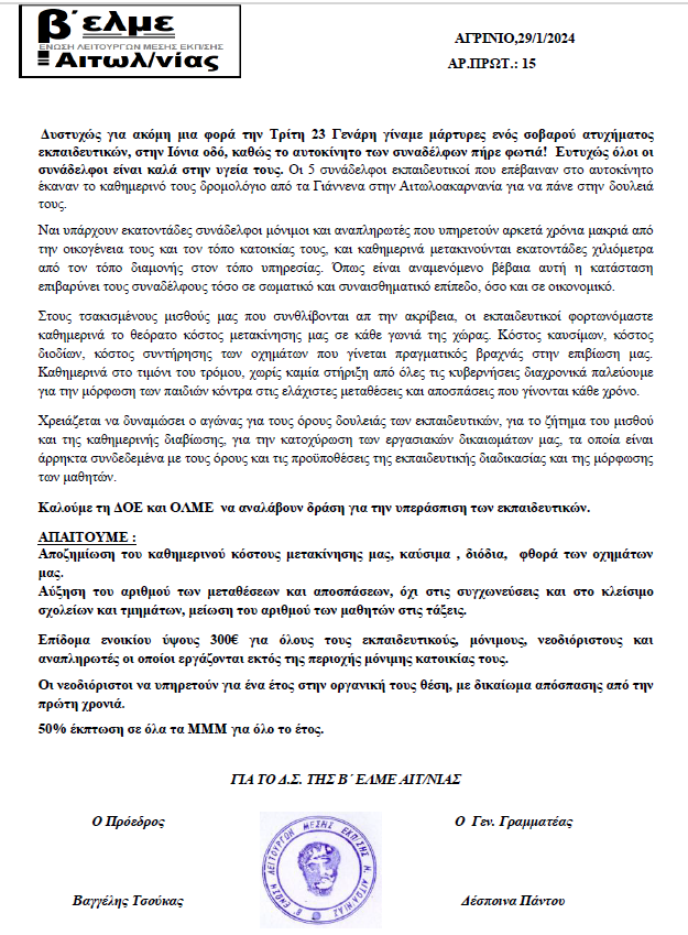 Η Β ΕΛΜΕ Αιτ/νίας για το περιστατικό ατυχήματος με συναδέλφους στην Ιόνια Οδό