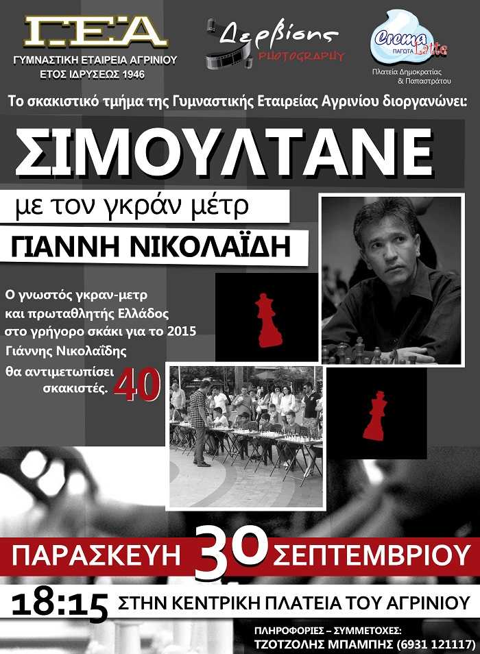 Στα πλαίσια του εορτασμού των εβδομήντα χρόνων από την ίδρυση της Γυμναστικής Εταιρείας Αγρινίου η σκακιστική ακαδημία της Γ.Ε.Α. διοργανώνει αγώνα επίδειξης σκακιού (σιμουλτανέ) την Παρασκευή 30 Σεπτεμβρίου 2016 και ώρα 18:15 στην κεντρική πλατεία του Αγρινίου.