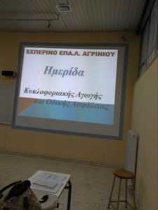 Η ΕΛΕΠΑΠ Αγρινίου παρούσα με τη συμμετοχή της Αντιπροέδρου της κ. Διαμαντοπούλου Όλγας και της κ. Κολοβού Λαμπρινής Γραμματέως της Τ.Δ.Ε. στις 25/04/2018 ημέρα Τετάρτη απόγευμα στην εκδήλωση-δράση «Κυκλοφοριακή Αγωγή-Οδική Ασφάλεια» που διοργάνωσε το Εσπερινό ΕΠΑΛ Αγρινίου.