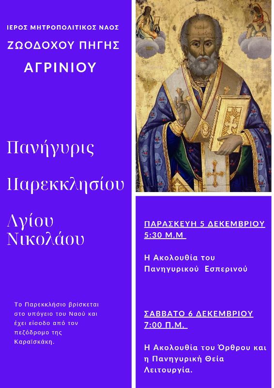 Το Σάββατο 6 Δεκεμβρίου 2025 και ώρα 7:00’ π. μ. θα τελεσθεί η Ακολουθία του Όρθρου και η Πανηγυρική Θεία Λειτουργία.