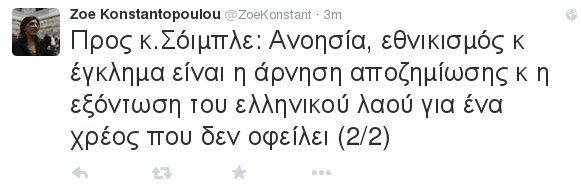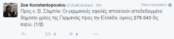 Μέσω του Twitter αποφάσισε η Ζωή Κωνσταντοπούλου να απαντήσει στα όσα είπε ο Βόλφγκανγκ Σόιμπλε για τις γερμανικές αποζημιώσεις.