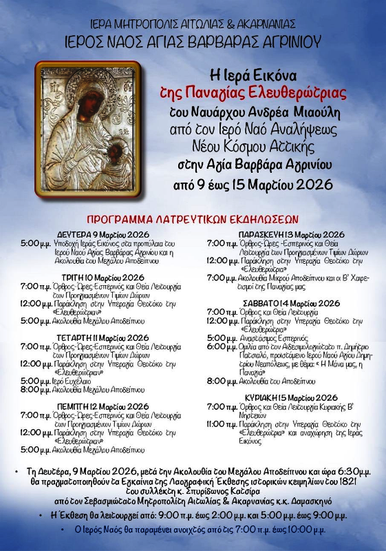 Την Ιερά και Ιστορική Εικόνα της Παναγίας της Ελευθερώτριας, του Ναυάρχου Ανδρέα Μιαούλη, εκ του Ιερού Ναού Αναλήψεως του Κυρίου Νέου Κόσμου, της Ιεράς Αρχιεπισκοπής Αθηνών θα υποδεχθεί ο Ιερός Ναός της Αγίας Βαρβάρας Αγρινίου.
