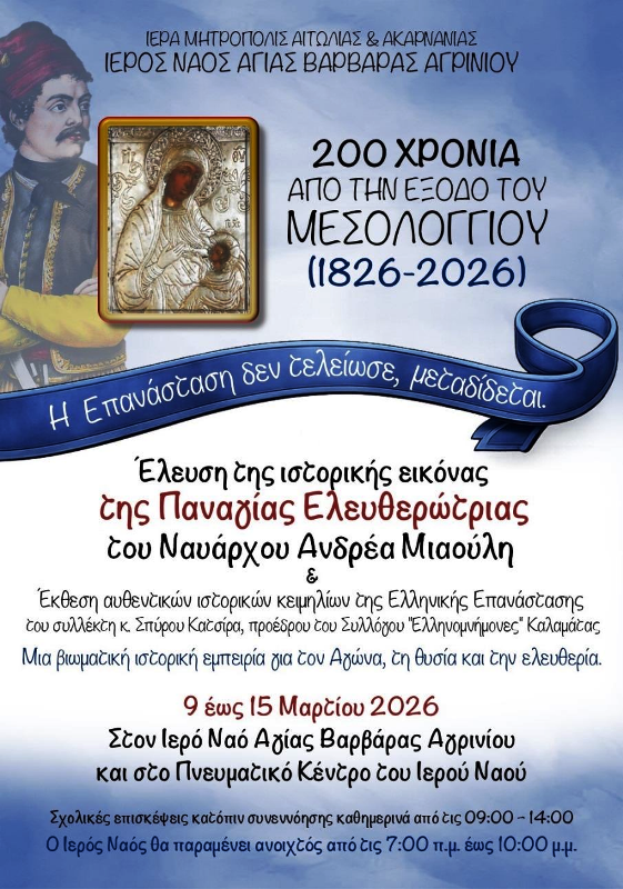 Η υποδοχή της Ιεράς Εικόνος και η έκθεση ιστορικών κειμηλίων εντάσσονται στις επετειακές εκδηλώσεις της Ιεράς Μητροπόλεως Αιτωλίας και Ακαρνανίας για τον εορτασμό των 200 ετών από την ηρωική Έξοδο του Μεσολογγίου.