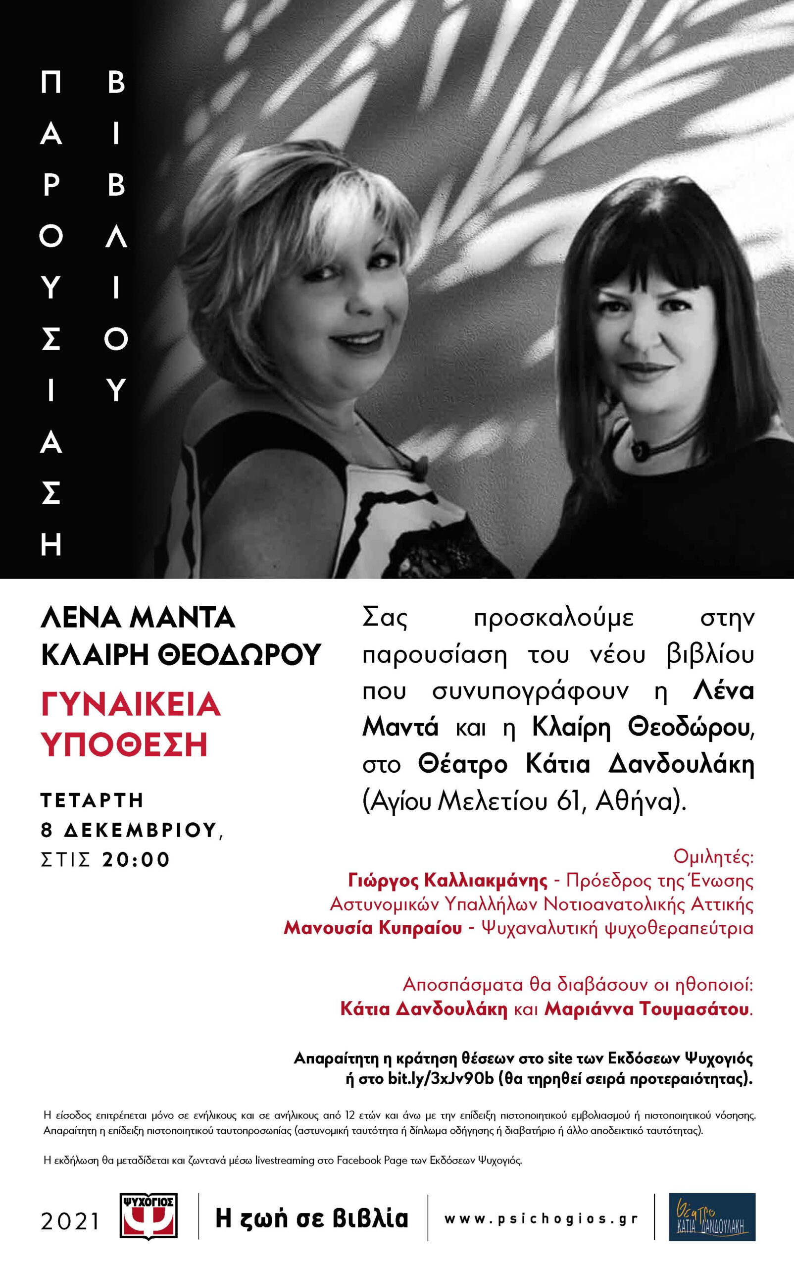 Σας προσκαλούμε στην παρουσίαση του νέου βιβλίου που συνυπογράφουν η Λένα Μαντά και η Κλαίρη Θεοδώρου, στο Θέατρο Κάτια Δανδουλάκη (Αγίου Μελετίου 61, Αθήνα).