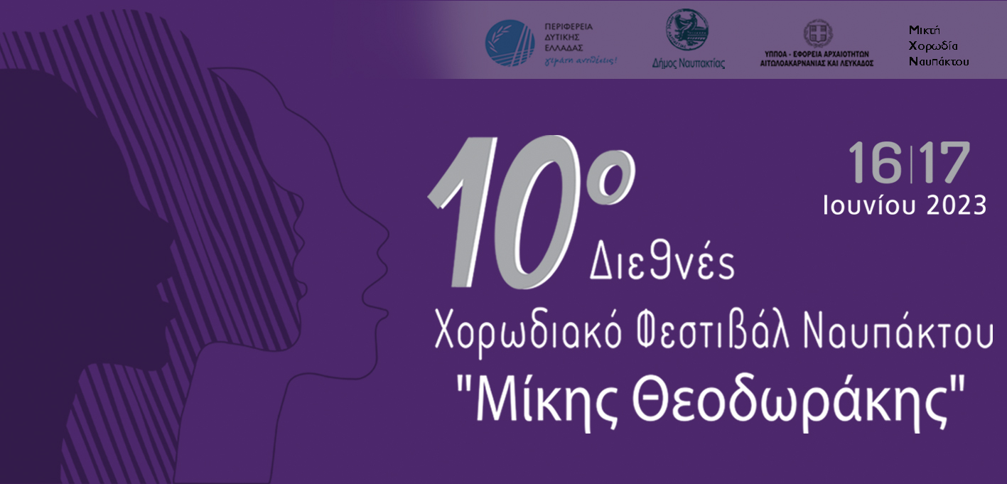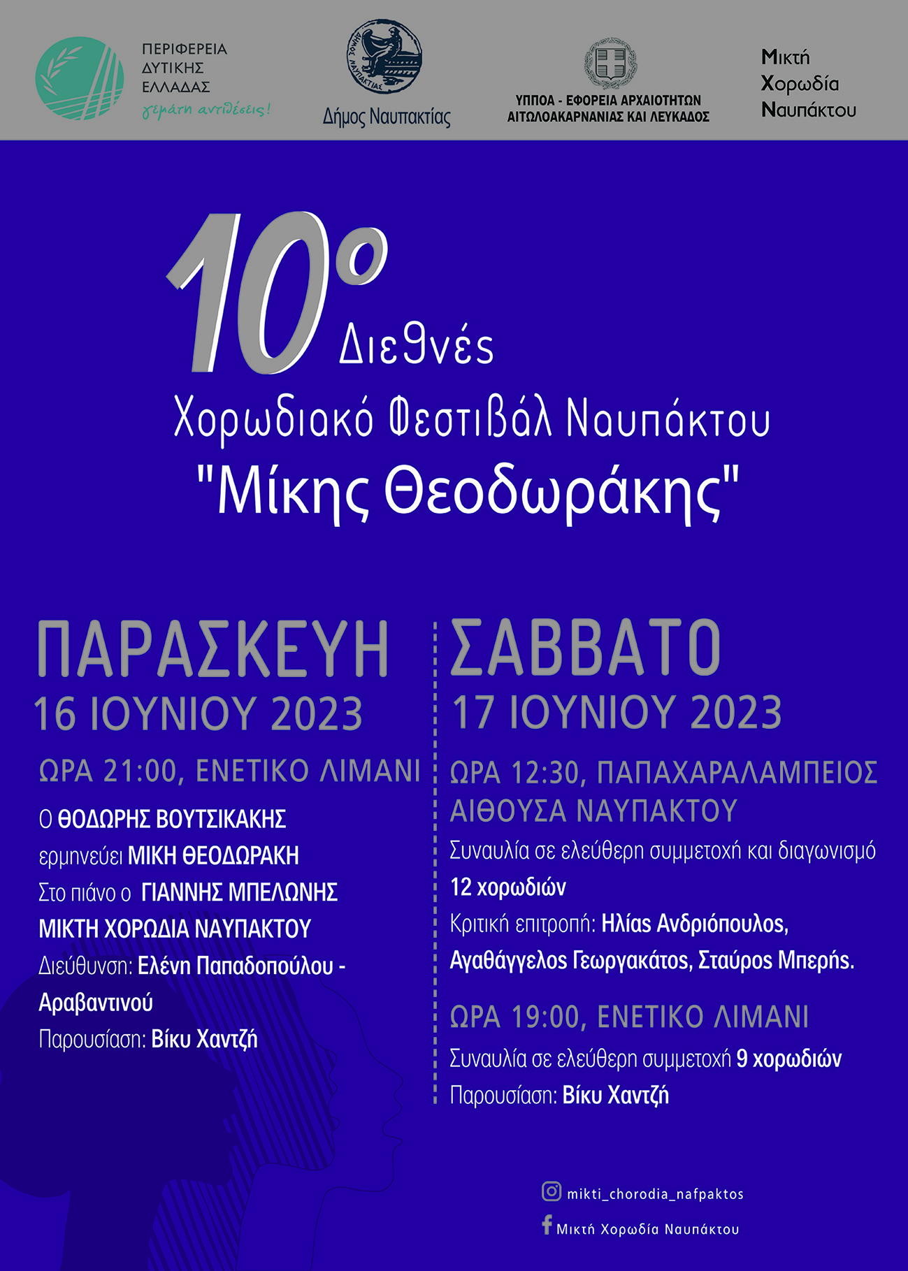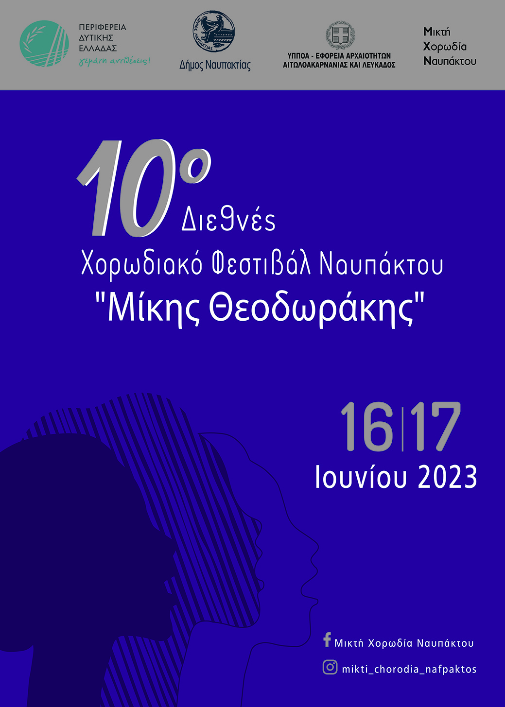 Ο Δήμος Ναυπακτίας σε συνδιοργάνωση με την Περιφέρεια Δυτικής Ελλάδας, την Εφορεία Αρχαιοτήτων Αιτωλοακαρνανίας και Λευκάδος και σε συνεργασία με τη Μικτή Χορωδία Ναυπάκτου παρουσιάζει στις 16 και 17 Ιουνίου 2023 το 10ο Διεθνές Χορωδιακό Φεστιβάλ Ναυπάκτου «Μίκης Θεοδωράκης»!