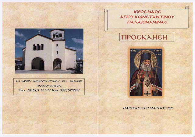 Η ενορία των Αγίου Κωνσταντίνου και Ελένης στην Παλαιομάνινα, υποδέχεται την Παρασκευή 11 Μαρτίου 2016, τα ιερά λείψανα του Αγίου Λουκά.