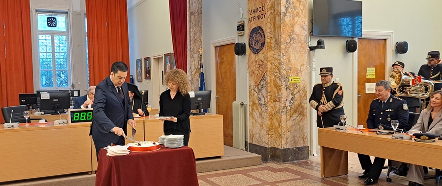 Ο Δήμαρχος Αγρινίου Γιώργος Παπαναστασίου παρουσία του Σεβασμιότατου Μητροπολίτη Αιτωλίας και Ακαρνανίας κ. Δαμασκηνού και του Γενικού Γραμματέα Εσωτερικών και Οργάνωσης, κ. Αθανάσιου Μπαλέρμπα έκοψε την Πρωτοχρονιάτικη Βασιλόπιτα στην αίθουσα συνεδριάσεων του Δημοτικού Συμβουλίου και ευχήθηκε για τη νέα χρονιά: