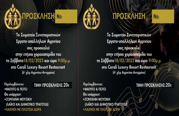 Ο Σύνδεσμος Συνεταιριστικών Υπαλλήλων του Α.Σ. Ένωση Αγρινίου διοργανώνει το Σάββατο 18 Φεβρουαρίου 2023 και ώρα 21:00 την ετήσια χοροεσπερίδα του στο χώρο συνεστιάσεων CORALI LUXURY RESORT RESTAURANT επί της Εθνικής Οδού Αγρινίου – Αντιρρίου.