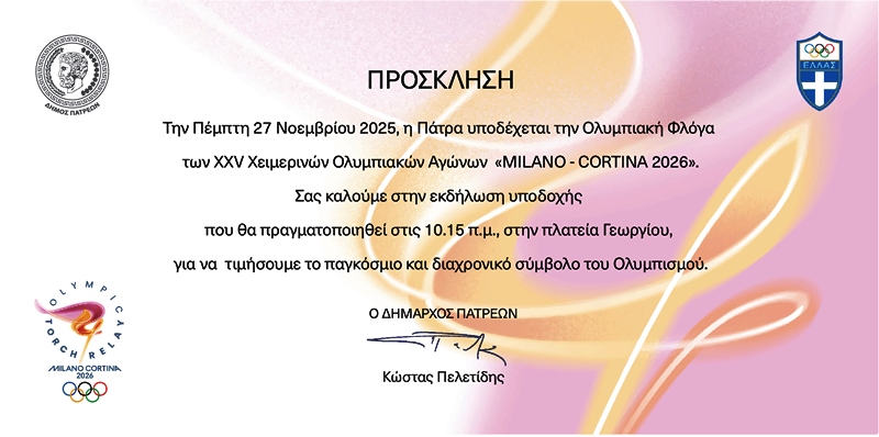 Η Πάτρα υποδέχεται, την Πέμπτη 27 Νοεμβρίου, την Ολυμπιακή φλόγα των Χειμερινών Ολυμπιακών Αγώνων Μιλάνο Κορτίνα 2026, μία ημέρα μετά την αφή της στην Αρχαία Ολυμπία.