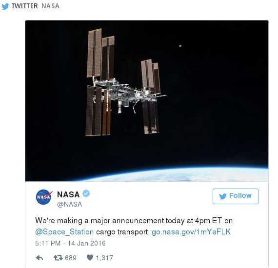 Αυτή τη φορά ωστόσο, δεν πρόκειται να ανακοινωθεί κάτι τόσο ανέλπιστο. Η NASA φρόντισε να ειδοποιήσει μέσω της επίσημης ιστοσελίδας της αλλά και με tweet, για μια πολύ μεγάλη ανακοίνωση που έχει να κάνει με την τροφοδότηση του Διεθνούς Διαστημικού Σταθμού.