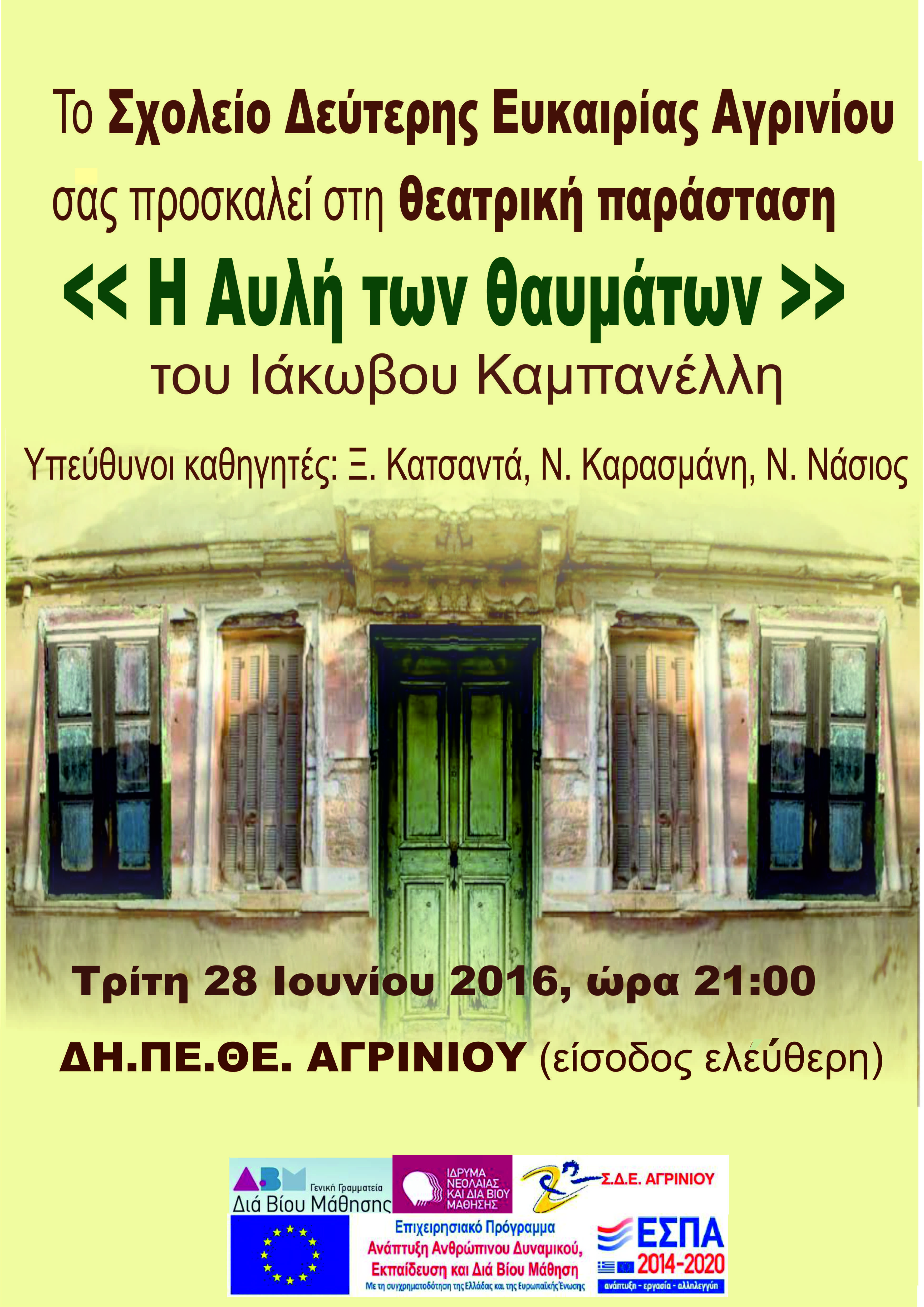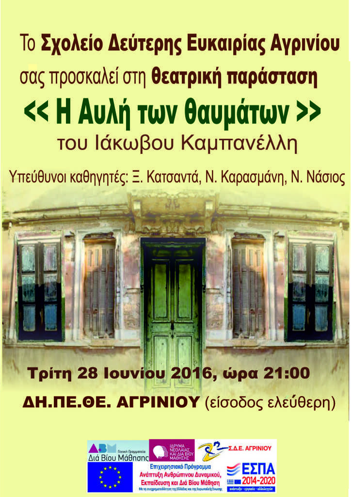 Η θεατρική ομάδα του Σχολείου Δεύτερης Ευκαιρίας Αγρινίου, στο πλαίσιο του ανοίγματος του σχολείου στην τοπική κοινωνία και της ανάδειξης του εκπαιδευτικού του έργου, παρουσιάζει τη θεατρική παράσταση «Η Αυλή των θαυμάτων» του Ιάκωβου Καμπανέλλη την Τρίτη 28-6-2016, ώρα 21:00 στο ΔΗΠΕΘΕ Αγρινίου.