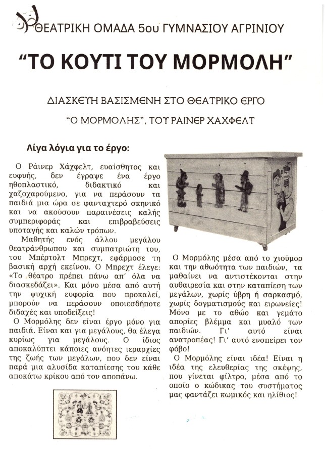 Το 5ο Γυμνάσιο Αγρινίου παρουσιάζει τη Θεατρική Παράσταση “Το κουτί  του Μορμόλη” Παρασκευή 28 Μαρτίου 2025, 8μμ, στο ΔΗΠΕΘΕ Αγρινίου.