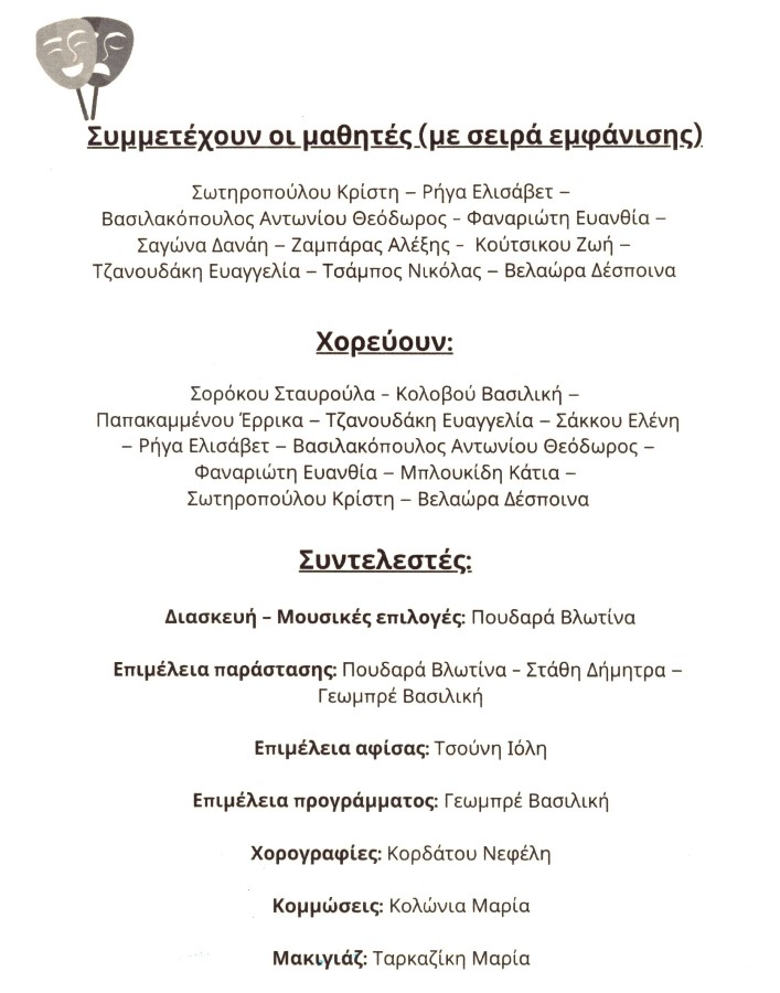 Πρόκειται για μια εφηβική παράσταση γεμάτη χαρά, μουσική και χορό, μα πάνω απ’ όλα γεμάτη από την αφοπλιστική ειλικρίνεια των νεαρών μαθητών μας.Σας προσκαλούμε λοιπόν όλους, μικρούς και μεγάλους, για να περάσετε  μια ευχάριστή βραδιά με το Μορμόλη του χτες και του σήμερα, το Μορμόλη  του αύριο και του πάντα.