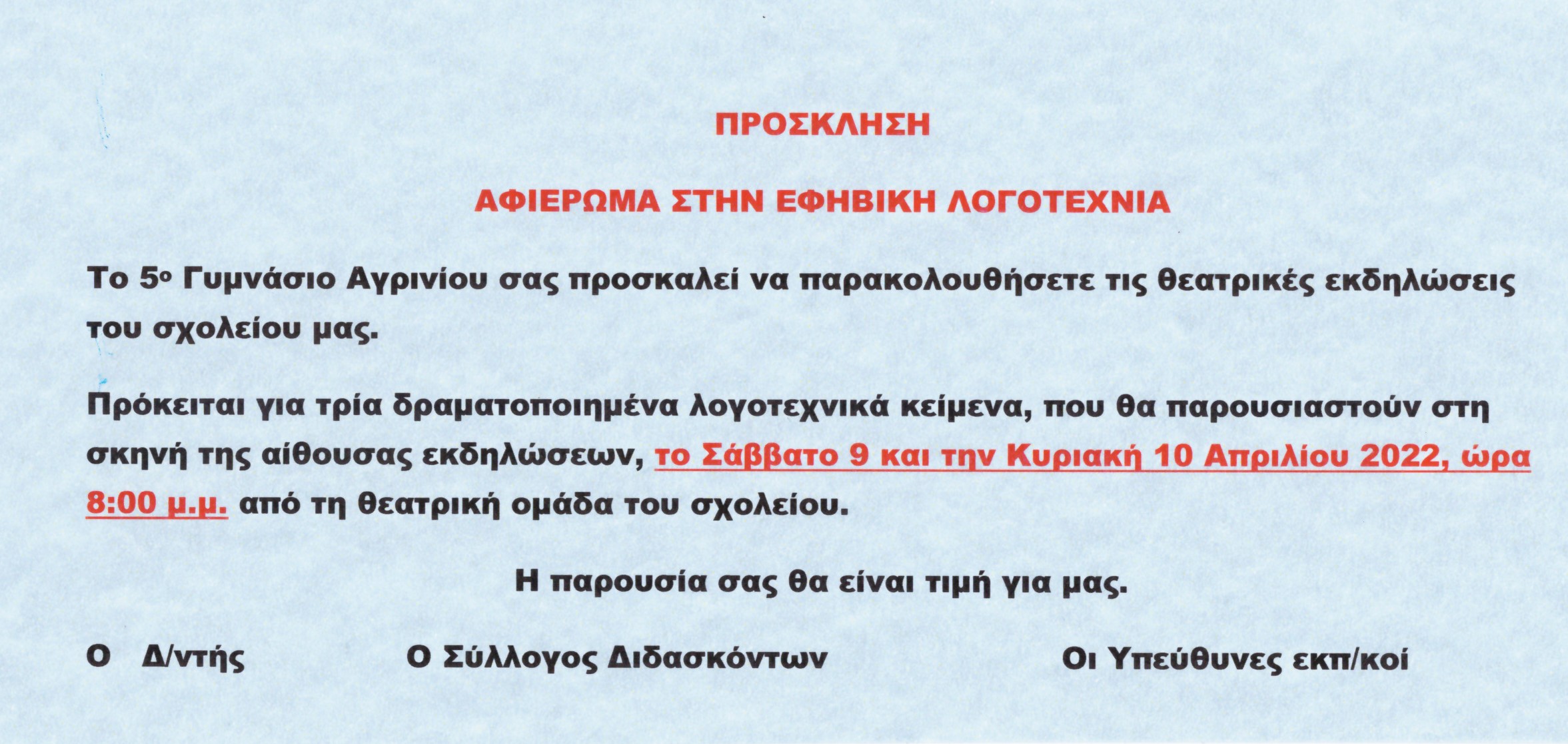 ΔΙΗΜΕΡΟ ΘΕΑΤΡΙΚΩΝ ΕΚΔΗΛΩΣΕΩΝ (9 και 10 Απριλίου, στο 5ο Γυμνάσιο Αγρινίου)