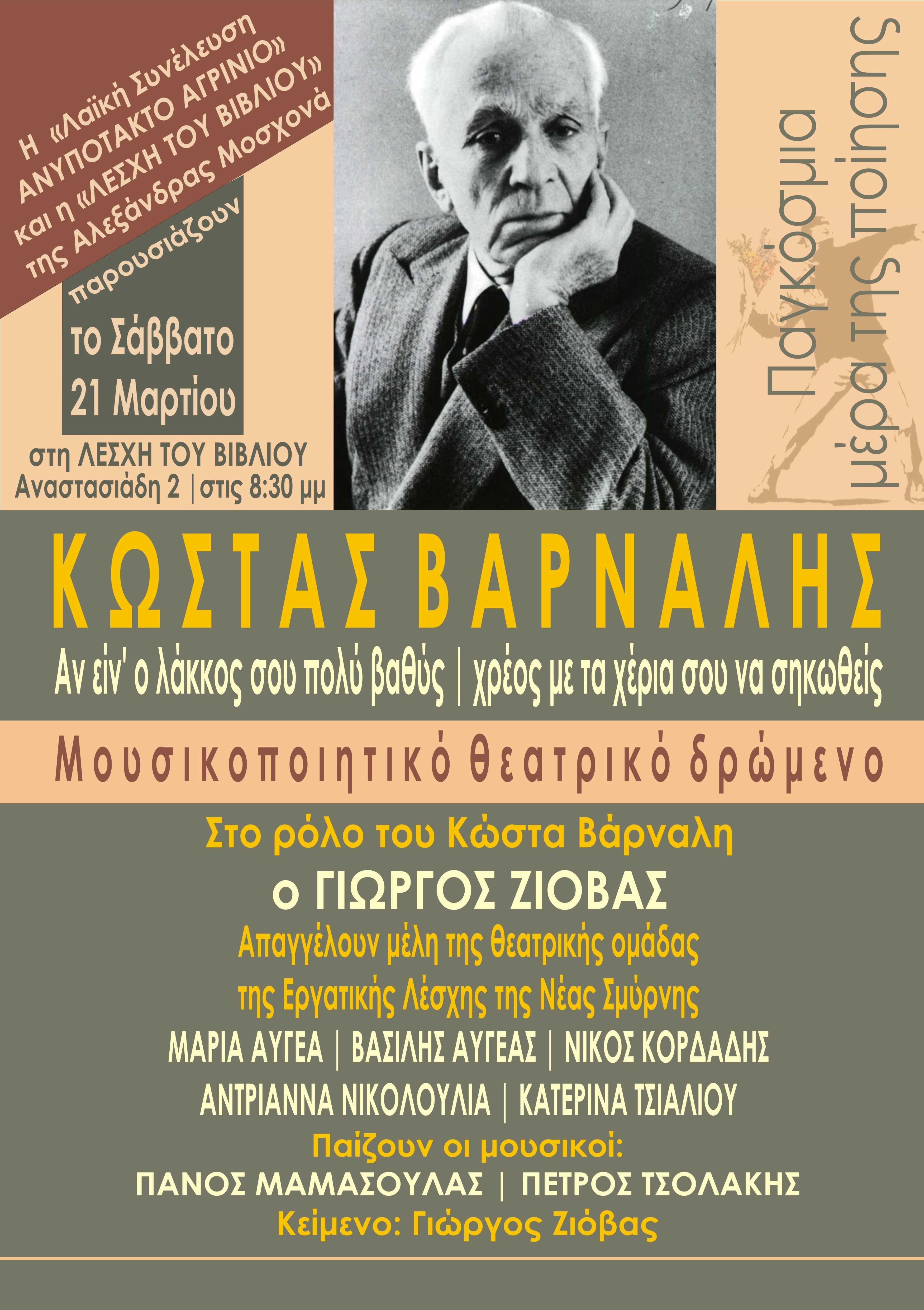 Η «Λαϊκή Συνέλευση Ανυπότακτο Αγρίνιο” και η «Λέσχη του Βιβιλίου» της Αλεξάνδρας Μοσχονά, παρουσιάζουν το Σάββατο 21 Μαρτίου στη Λέσχη του βιβλίου στις 8:30 το βράδυ το Μουσικοποιητικό θεατρικό δρώμενο Κώστας Βάρναλης: