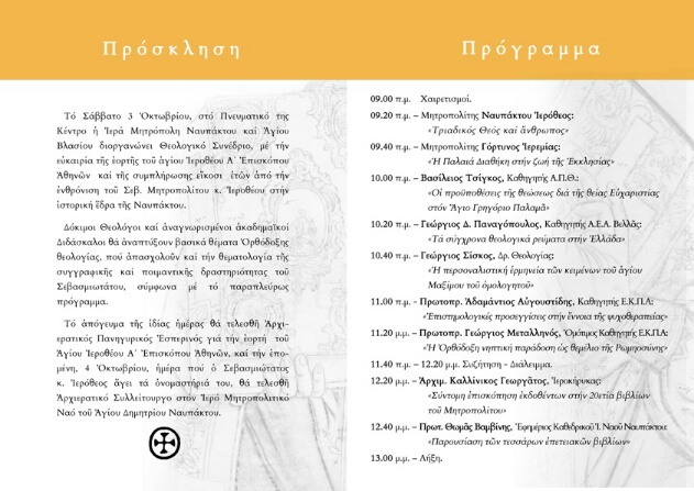 Το Σάββατο 3 Οκτωβρίου η Ιερά Μητρόπολη Ναυπάκτου και Αγίου Βλασίου διοργανώνει Θεολογικό Συνέδριο.