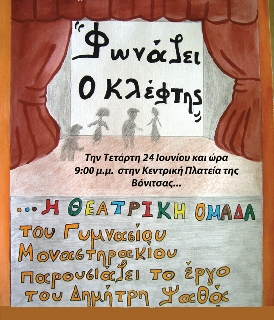 Την Τετάρτη 24 Ιουνίου στην Κεντρική Πλατεία της Βόνιτσας στις 21.00 οι μαθητές του Γυμνασίου Μοναστηρακίου θα παρουσιάσουν το θεατρικό έργο του Δημήτρη Ψαθά « ΦΩΝΑΖΕΙ Ο ΚΛΕΦΤΗΣ » . Μία παράσταση που τα παιδιά του Μοναστηρακίου παρουσίασαν με μεγάλη επιτυχία στα πλαίσια του 6ου Μαθητικού Φεστιβάλ θεάτρου στο Δημοτικό θέατρο Αγρινίου.