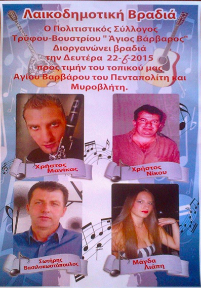 Την Δευτέρα 22 Ιουνίου μετά το μέγα πανηγυρικό εσπερινό μετ’αρτοκλασίας και Θείου κηρύγματος, που θα τελεστεί ώρα 19.00 το απόγευμα ,στην πηγή του Αγ.Βαρβάρου απαράμιλλης ομορφιάς, όπου βρίσκεται και το ομώνυμο ξωκλήσι του Αγίου Βάρβαρου με τους φυσικούς καταρράκτες. Ο «εξωραϊστικός πολιτιστικός σύλλογος Τρύφου-Βουστρίου “Αγ.Βάρβαρος” , σε συνεργασία με το Κέντρο Κοινωνικής Μέριμνας και Ανάπτυξης του Δήμου Ακτίου Βόνιτσας , θα πραγματοποιήσει στην πλατεία (Αγ.Νικολάου) Τρύφου λαϊκοδημοτική βραδιά .