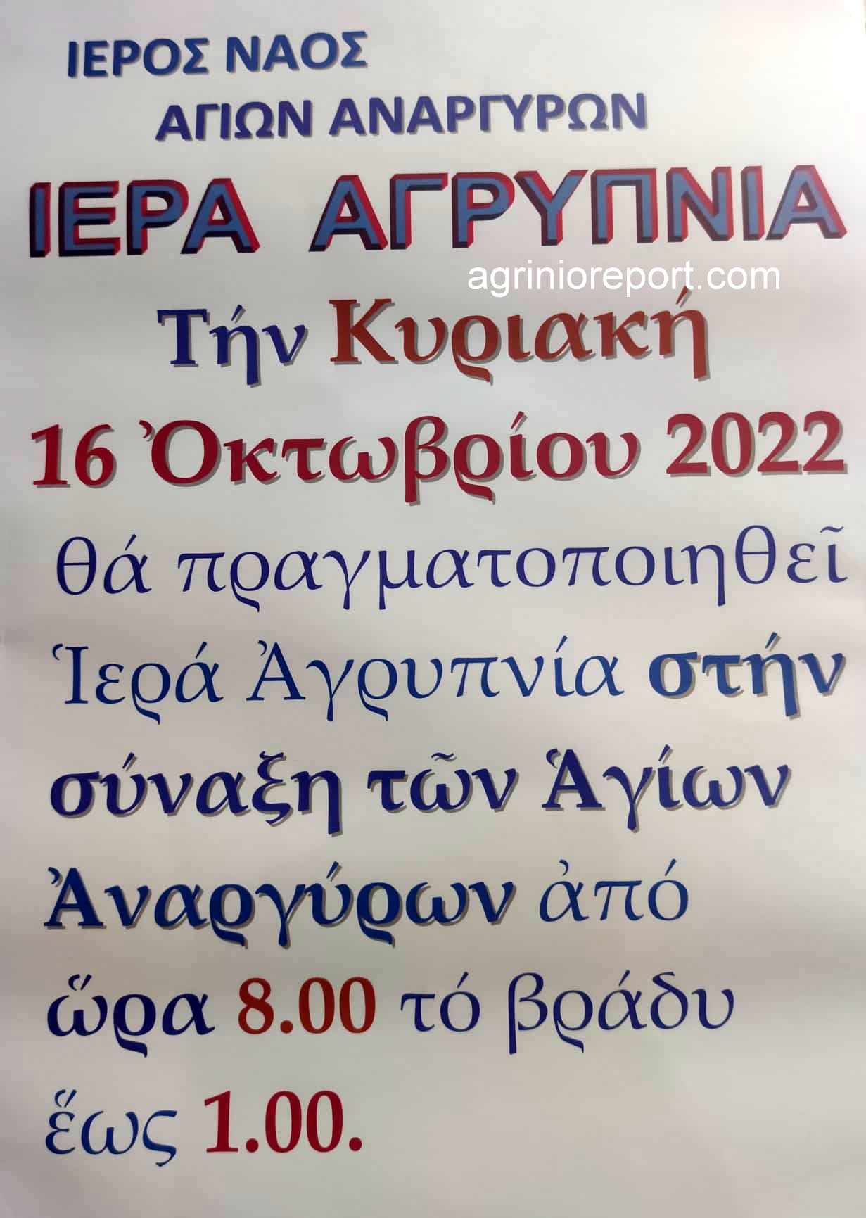 Ιερά Αγρυπνία στον Ι.Ν. Αγ. Αναργύρων Αγρινίου την Κυριακή 16 Οκτωβρίου