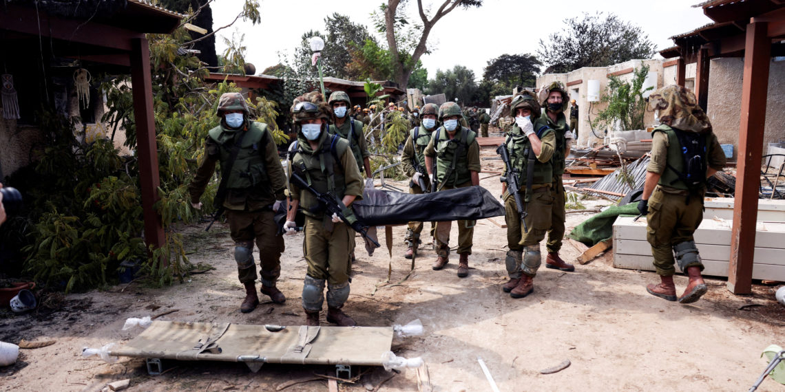 Israeli soldiers carry the body of a victim of an attack by militants from Gaza at Kibbutz Kfar Aza, in southern Israel, October 10, 2023. REUTERS/Ronen Zvulun TPX IMAGES OF THE DAY