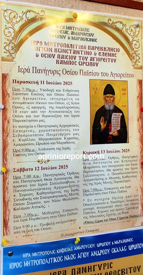 Πανηγυρικός Αρχιερατικός Εσπερινός μετά αρτοκλασσίας χοροστατούντος του Σεβασμιωτάτου κ.Κυρίλλου Μητροπολίτου Κηφισίας, Αμαρουσίου Ωρωπού και Μαραθώνος εψάλλει εχθές το απόγευμα στο Ιερό Μητροπολιτικό Παρεκκλήσιο Αγίων Κωνσταντίνου και Ελένης και Οσίου Παϊσίου του Αγιορείτου Κάμπος Ωρωπού παρουσία πλήθος κόσμου.