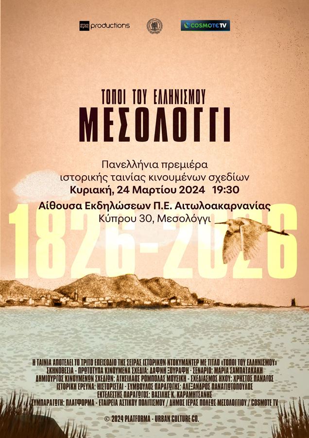 Ο Δήμος Ιεράς Πόλεως Μεσολογγίου, σε συνεργασία με το ANIMASYROS Διεθνές Φεστιβάλ Κινουμένων Σχεδίων, διοργανώνει την πανελλήνια πρεμιέρα της ιστορικής ταινίας κινουμένων σχεδίων με τίτλο ΤΟΠΟΙ ΤΟΥ ΕΛΛΗΝΙΣΜΟΥ: ΜΕΣΟΛΟΓΓΙ την Κυριακή, 24 Μαρτίου 2024 στις 19.30, στην αίθουσα εκδηλώσεων της Περιφερειακής Ενότητας Αιτωλοακαρνανίας (Κύπρου 30, Μεσολόγγι).