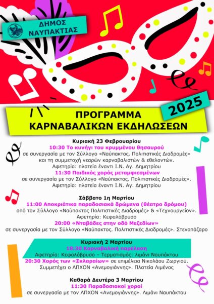 Ο Δήμος Ναυπακτίας προσκαλεί όλες και όλους στις φετινές καρναβαλικές εκδηλώσεις που ξεκινούν αυτή την Κυριακή, 23 Φεβρουαρίου!  Πολλές εκπλήξεις για τα παιδιά, κρυμμένος θησαυρός, χορός μεταμφιεσμένων, καρναβαλική παρέλαση, Νταβάδες στην οδό Μεζεδίων, χορός των Σκλαραίων και ανήμερα την Καθαρά Δευτέρα παραδοσιακοί χοροί στο Ενετικό Λιμάνι της πόλης, περιλαμβάνονται στο φετινό πρόγραμμα.