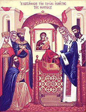 Θεοτόκε ἀειπάρθενε, τῶν ἀνθρώπων ἡ σκέπη, Ἐσθῆτα καὶ Zώνην τοῦ ἀχράντου σου σώματος, κραταιὰν τῇ πόλει σου περιβολὴν ἐδωρήσω, τῷ ἀσπόρῳ τόκῳ σου ἄφθαρτα διαμείναντα, ἐπὶ σοὶ γὰρ καὶ φύσις καινοτομεῖται καὶ χρόνος, διὸ δυσωποῦμέν σε, εἰρήνην τῇ πολιτείᾳ σου δώρησαι, καὶ ταῖς ψυχαῖς ἡμῶν τὸ μέγα ἔλεος.
