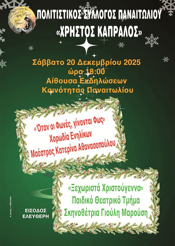 Η εκδήλωση θα πραγματοποιηθεί το Σάββατο 20 Δεκεμβρίου 2025 και ώρα 18.00μ.μ. στην Αίθουσα Εκδηλώσεων της Κοινότητας Παναιτωλίου.
