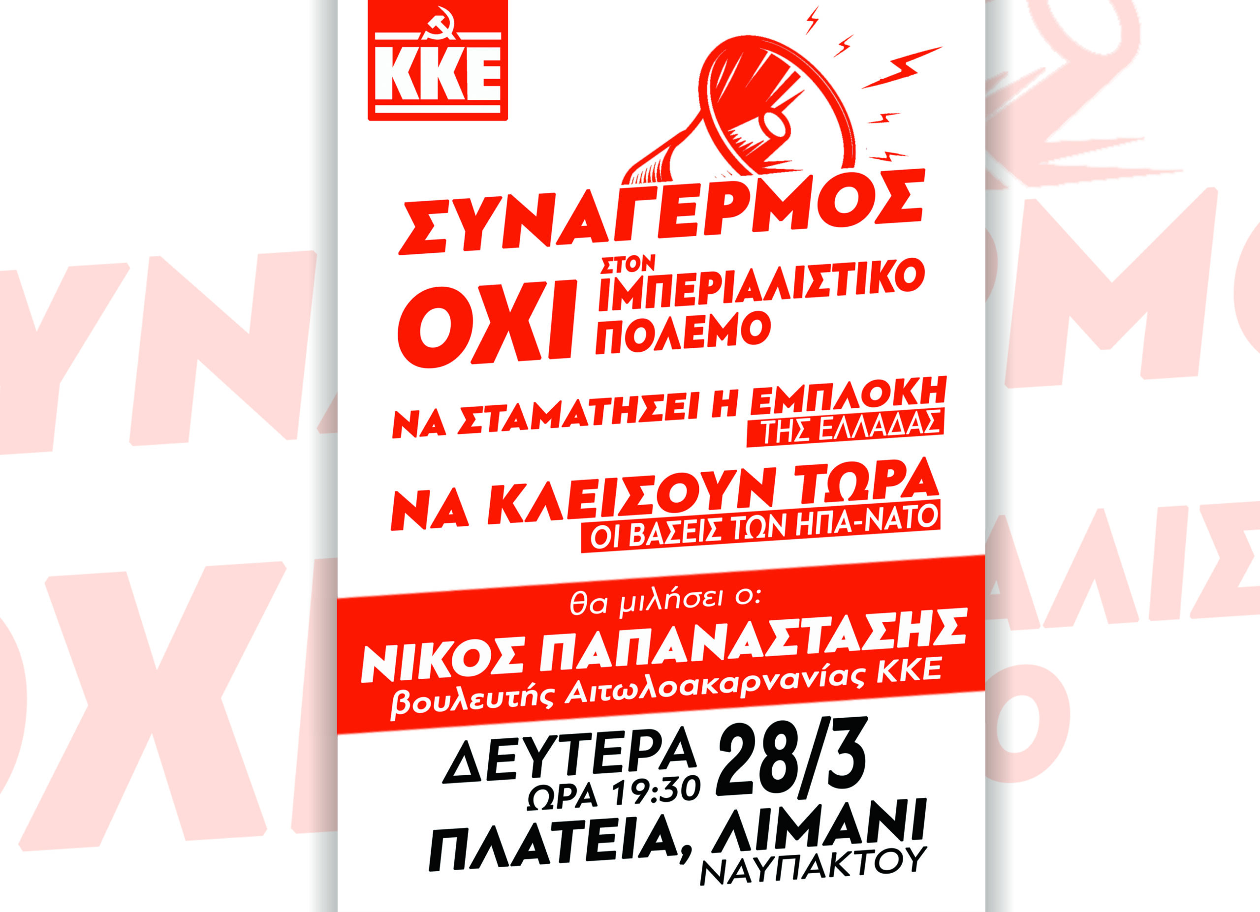- Δευτέρα 28/3, στην πλατεία στο Λιμάνι, στις 7:30μμ, η ΚΟΒ Ναυπάκτου διοργανώνει συγκέντρωση με ομιλητή τον Νίκο Παπαναστάση, βουλευτή Αιτωλοακαρνανίας του ΚΚΕ.