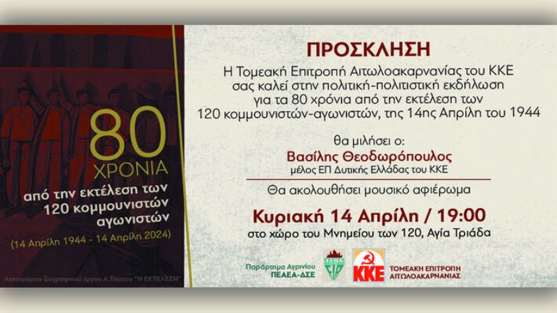 Πολιτική – πολιτιστική εκδήλωση για τη συμπλήρωση 80 χρόνων από την εκτέλεση των 120 κομμουνιστών και αγωνιστών της εθνικής αντίστασης από τα γερμανικά στρατεύματα κατοχής, στις 14 Απρίλη 1944, διοργανώνουν ανήμερα της επετείου την Κυριακή, στις 7 μ.μ. η ΤΕ Αιτωλοακαρνανίας του ΚΚΕ από κοινού με το Παράρτημα Αγρινίου της ΠΕΑΕΑ-ΔΣΕ στον χώρο του μνημείου των εκτελεσμένων στην Αγία Τριάδα.