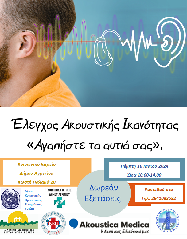 Το Κοινωνικό Ιατρείο της Διεύθυνσης Κοινωνικής Προστασίας και Δημόσιας Υγείας και η αρμόδια Αντιδήμαρχος Γεωργία Μπόκα σας προσκαλούν σε δράση πρόληψης και πρώιμης διάγνωσης της ακουστικής ικανότητας με τίτλο: