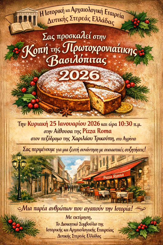 η Ιστορική και Αρχαιολογική Εταιρείας Δυτικής Στερεάς Ελλάδας σας προσκαλεί στην κοπή της πρωτοχρονιάτικης βασιλόπιτας της Εταιρείας την Κυριακή 25 Ιανουαρίου 2026 και ώρα 10:30 π.μ. στην Pizza Roma στον πεζόδρομο της Χαριλάου Τρικούπη.