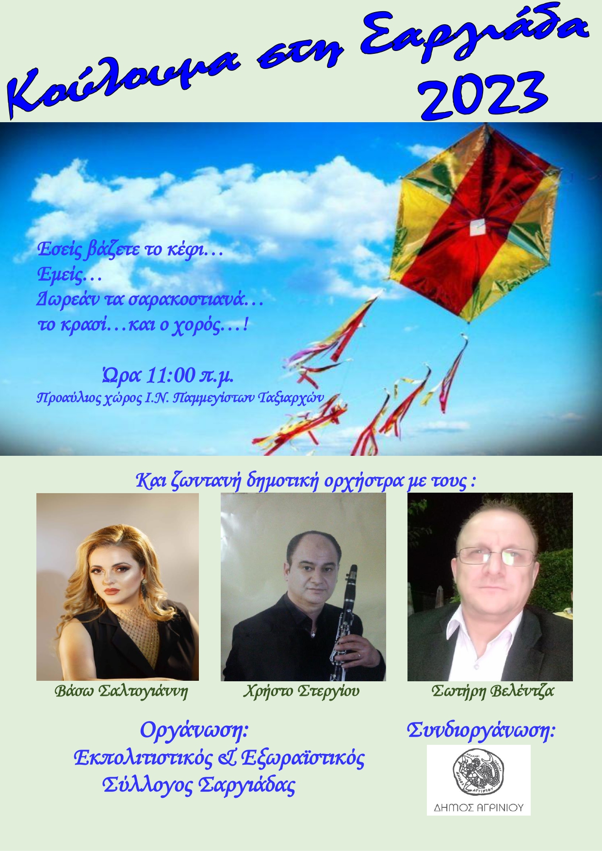 Ο Πρόεδρος και τα μέλη του Δ.Σ. του Εκπολιτιστικού και Εξωραϊστικού Συλλόγου Σαργιάδας σας προσκαλεί στα Κούλουμα 2023, που συνδιοργανώνει με τον Δήμο Αγρινίου την καθαρά Δευτέρα 27 Φεβρουαρίου στη Σαργιάδα Αγρινίου και ώρα 11:00 π.μ.