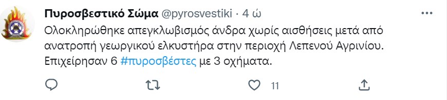 Οι οικείοι του καθώς ο 62χρονος άνδρας δεν είχε δώσει σημεία ζωής από χθες το μεσημέρι, άρχισαν να τον ψάχνουν. Κάλεσαν άμεσα την Αστυνομία η οποία άρχισε έρευνες για τον εντοπισμό του καθώς και ομάδα της ΟΠΚΕ. Δυστυχώς εντοπίστηκε ο άτυχος άνδρας αργά το βράδυ καταπλακωμένος από το αγροτικό του μηχάνημα στην Λεπενού του Δήμου Αγρινίου(πρώην Δ.Στράτου). Για τον απεγκλωβισμό του επιχείρησαν 6 πυροσβέστες με 3 οχήματα.