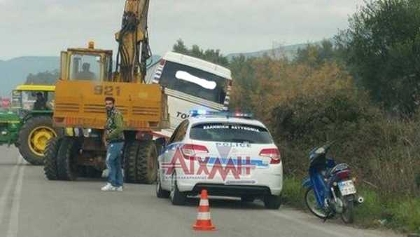Στον αύλακα που βρίσκεται δίπλα από το δρόμο Μεσολογγίου – Αιτωλικού έπεσε ένα λεωφορείο καθώς υποχώρησε το οδόστρωμα την στιγμή που ο οδηγός, σύμφωνα με την μαρτυρία του, έκανε δεξιά για να τον προσπεράσει άλλο όχημα.