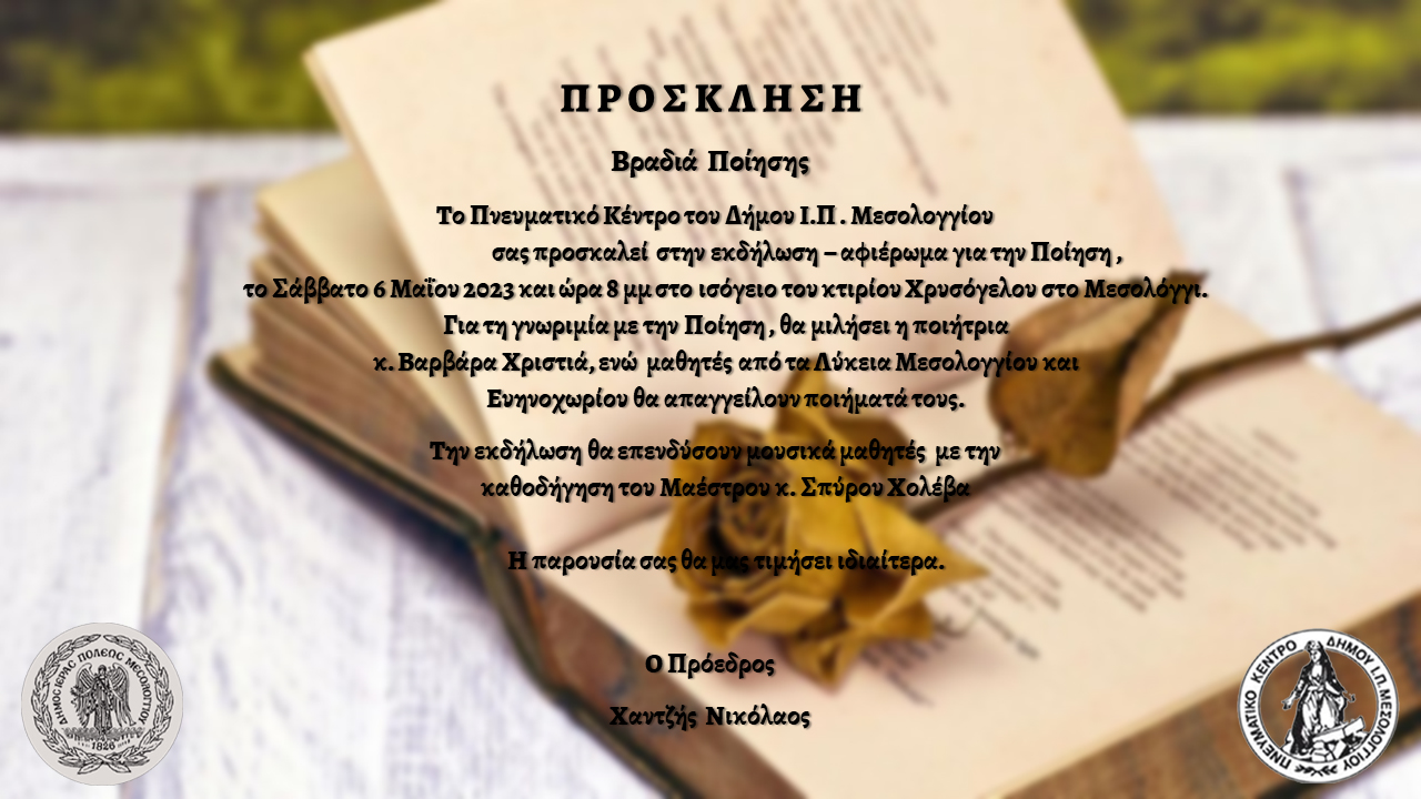 Το Πνευματικό Κέντρο του Δήμου Ι.Π. Μεσολογγίου το Σάββατο 6 Μαΐου 2023 και ώρα 8:00 μ.μ. προσκαλεί το κοινό σε μια όμορφη και ιδιαίτερη εκδήλωση – αφιέρωμα για την ποίηση με τίτλο: «Βραδιά Ποίησης» που θα λάβει χώρα στο ισόγειο του Κτιρίου Χρυσόγελλου.