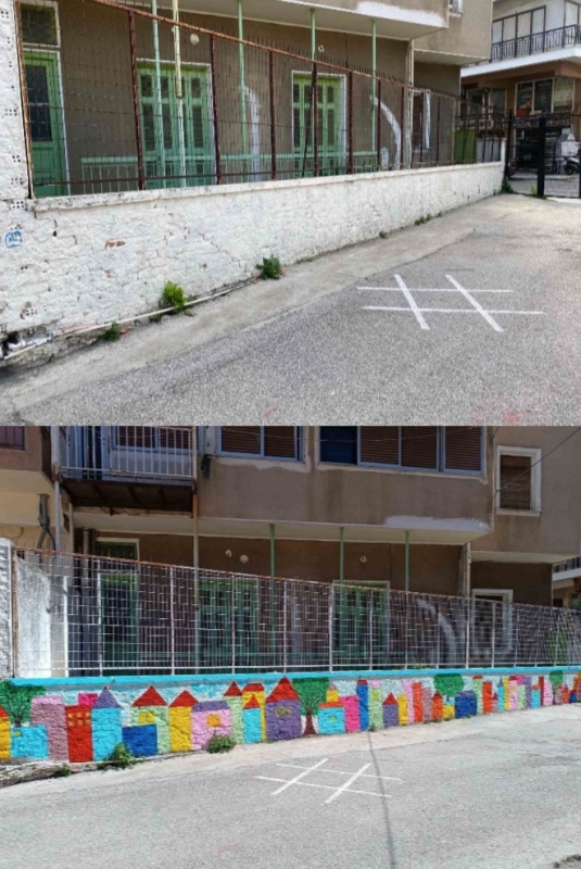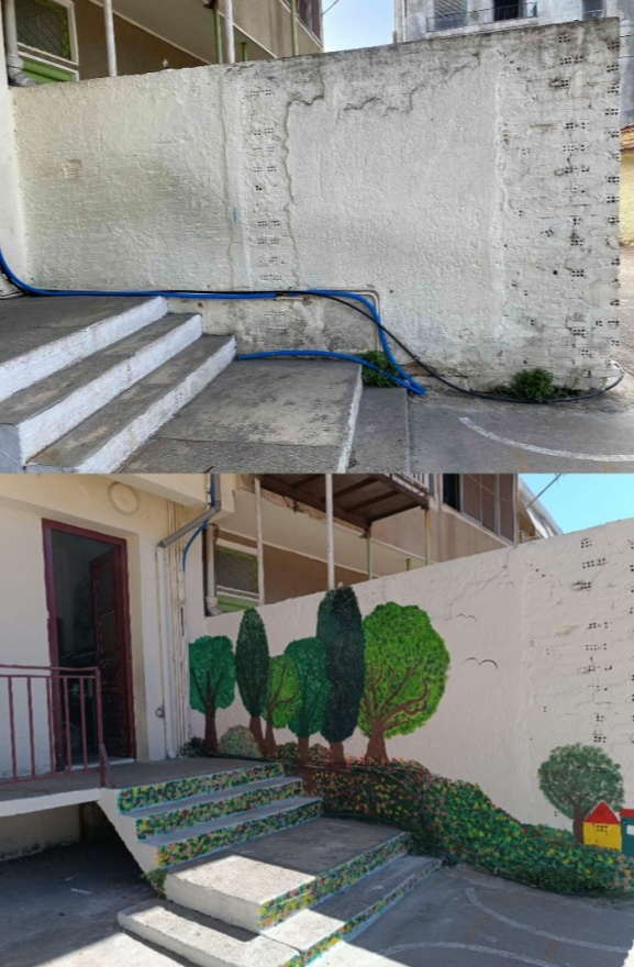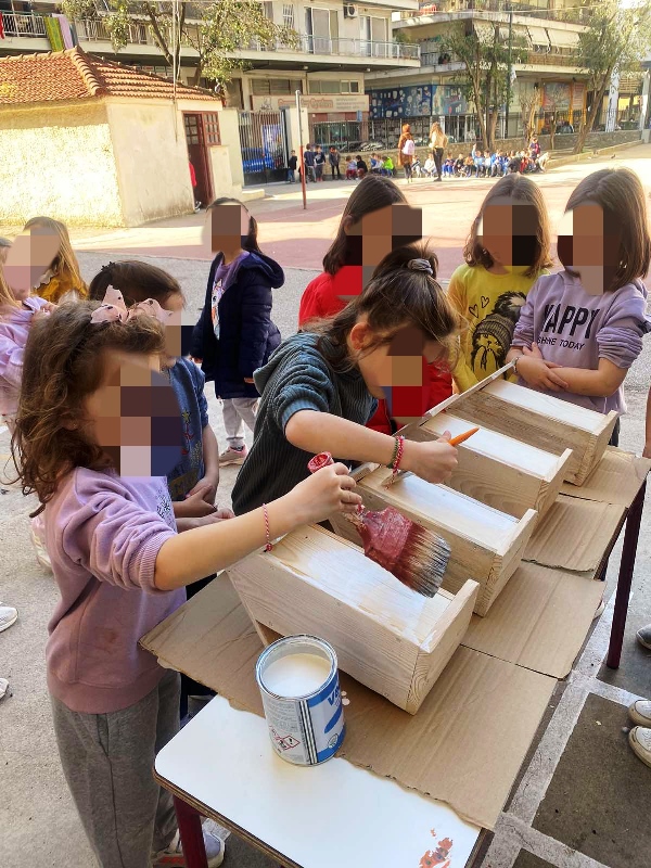 Παράλληλα τα δέντρα του σχολείου γέμισαν από ξύλινες φωλιές πουλιών που κατασκευάστηκαν από τους μαθητές σε συνεργασία με ξυλουργό της περιοχής. Ξεχωριστή η ιδέα των μαθητών να δώσουν χρώμα στους άσπρους τοίχους της αυλής, με όμορφα σχέδια και δημιουργίες!